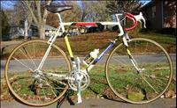 The Look Equipe was the team issue cycle selected by Bernard Tapie for his La Vie Claire team. The frameset is silver-soldered Reynolds 753 tubing and bears the distinctive La Vie Claire paint scheme. This model bears the commemorative certificate that it was produced during Hinault's retirement year of 1986. The cycle is equipped with the correct first-generation Look clipless pedals and LeMond's favorite Avocet cyclometer (one of the first available). The water bottle also bears mentioning, as this Specialized-brand Greg LeMond commemorative model was quickly recalled by Taco Bell as a choking hazard. This is one of the few that still has the original "dangerous" spout that easily comes out of the bottle into your throat if you suck on it too hard, since I never returned it to trade in for an "approved" model and free taco. |