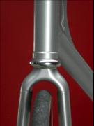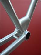 Michael Huebner used his TEXTIMA machines till 1994, 5 years after reunion. In 1995 he turned this bike for a FES full carbon monocoque bike with rear disc wheel, and he continued to use his signature steel goose neck (or in German”beer-tap”) stem and bar. He used as a member of the East German national team wheels with 40 bladed spokes in the rear and radial laced in the front, in spite that the radial pattern was not sanctioned by the NJS. The radial pattern was considered till the mid / end 90ties as inferior in lateral and radial stiffness over 3 cross with tied and soldered spoke crossing. In reality is the radial pattern the stiffest design for a wheel which doesn’t need to transfer torque ( e.g. front wheel) The tied and soldered spoke crossing doesn’t add any stiffens to the wheel except that it shifts the resonance frequency into an significant higher range. Later as an Pro his bike was equipped with C-Record components and a Nuovo Record chainring (49t). Double straps and Continental Sonderklasse 175 gram tires are completing the set up. |