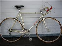 Second best Olympia racing model, after Competizione Super Leggera. Double-butted tubing (probably Falck), equipped with Campagnolo Record derailleurs, three arm cotterless Campy Sport crank, Sheffield Sprint pedals, Nuovo Tipo hubs (high or low flange), Nisi tubular rims, Universal Super 68 sidepull brakes & levers; TTT bars and stem; chrome steel tubular seat post, plastic saddle (often, but not exclusively Frecchia d'Oro; sometimes suede covered) & Ofmega headset. Pearlescent white finish with chrome head lugs, fork crown & chrome drop-out clamping surfaces.