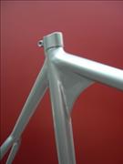 Michael Huebner used his TEXTIMA machines till 1994, 5 years after reunion. In 1995 he turned this bike for a FES full carbon monocoque bike with rear disc wheel, and he continued to use his signature steel goose neck (or in German”beer-tap”) stem and bar. He used as a member of the East German national team wheels with 40 bladed spokes in the rear and radial laced in the front, in spite that the radial pattern was not sanctioned by the NJS. The radial pattern was considered till the mid / end 90ties as inferior in lateral and radial stiffness over 3 cross with tied and soldered spoke crossing. In reality is the radial pattern the stiffest design for a wheel which doesn’t need to transfer torque ( e.g. front wheel) The tied and soldered spoke crossing doesn’t add any stiffens to the wheel except that it shifts the resonance frequency into an significant higher range. Later as an Pro his bike was equipped with C-Record components and a Nuovo Record chainring (49t). Double straps and Continental Sonderklasse 175 gram tires are completing the set up. |