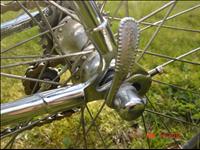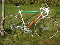 From Classic Rendezvous: Gianni Motta ended a distinguished pro career (as the sometimes nemesis, sometimes team mate to Eddy Merckx) by opening his own bicycle production workshop. A physically big man himself, Motta frames were noted for stiff, efficient power transmission and the Italian national tri-color paint jobs on the top model! He used distinctive seat stays that were bent inward at the brake bridge area and a capped seat stay "top eye."