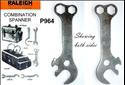 This would appear to have been a very popular multi-tool, judging by the fact that a good number of them are still available on eBay etc. I've attached a 1930's Raleigh info sheet referring to the tool and others- it doesn't mention re applications for these tools, but what I have found is that its 17mm jaws are very well suited for working on slotted bottom bracket cups, due to the jaw's having a noticeably greater depth than any ordinary 17mm spanners I've come across, so allowing a reliable purchase on the long flats of these BBs. Nowadays, we have a specialised tool just for this purpose (Park Tools seem to make the only one out there), but, after searching for a long time(!), this Raleigh tool would appear to be the only thing resembling a reliable tool for this job, which is strange when considering that the slotted BBs must have been enormously more commonplace in this tool's era (and for many years after) than they are today! |