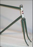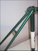 This frame was made in the UK perhaps by Tom Board a builder who made a lot of private label frames. It's made of light gage Reynolds 531 tubing with Nervex Professional lugs. The dropouts are the old Campagnolo 1060 stamped steel vertical models to accommodate the short chainstays.