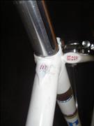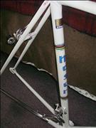 2150g frame and 634g fork. Falck cromoly tubing. 56cm seattube, c-c and 56cm toptube, c-c. Downtube is 64cm c-c. 26.6mm seatpost. Stock, steel fork replaced with 1990's F. Moser threadless, aluminum fork. 126mm dropout width. Lugs pantographed with M, dropouts,fork ends and brake bridge F. Moser pantographed.