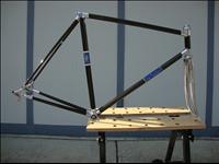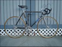 Per the little information available in the net, the Line Seeker CF bicycle was the precursor of the Exxon Graftek CF bicycle, before it was supposedly bought up by Exxon for their pioneering Exxon Graftek bicycle program. So the Line Seeker bicycle can be considered the prototype of the Graftek, preceding the Graftek by about two years before the Graftek was produced and sold to the public. The frame is constructed (Main triangle, chain and seat stays and head tube) from very thin guage aluminum tubing, wrapped in about 1/8" thick of carbon fiber. The tubes are pinned with roll pins at the brake bridge/ seat stays, BB/seat tube, BB/down tube and lower head lug/down tube connections and bonded with an epoxy compound to chromed steel lugs with 70's era Campagnolo dropouts and top of BB shell brazed-on cable guides. No shifter bosses or top tube cable guides are included in the frame as how it was with the later Graftek. The fork is constructed with an investment cast flat topped crown and Reynolds 531 oval to round profile fork legs and possibly 531 steerer tubes too. The frame was supplied with a proprietary sized 23.8mm diameter seatpost, made by milling down a 26mm Campagnolo Nuovo Record seatpost inside and out to achieve low weight and the correct diameter to fit into the small ID seat tube. Not too many of the Line Seeker bicycles/frames seemed to have survived through the years as some speculate that Exxon might have acquired the remainder of the Line Seeker stock when they were bought up and the bikes were either re-labled as Exxon Grafteks or disposed of. The frame tubes are finished in a deep clear finish thought to be clear Dupont Imron, that shows off the single directional Carbon Fiber filaments going the longitudinal direction on all tubes, such as might have been seen in some early carbon fiber fishing poles. Not much more information exists out there about this bike, maybe because Exxon suppressed the early history of the Graftek (maybe to bolster their claim of having the first US made mass produced CF bicycle??) and the Line Seeker might possibly be the victim of that effort, thus the scant historical information available out there on this pioneering American bicycle? Internet sourced records do show that Exxon owned the rights to the Line Seeker brand for some time, but has since let registration of ownership of the brand name "pass/expire". |