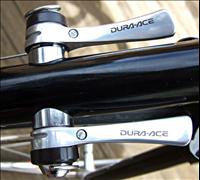 The Kuwahara Triathlon was originally sold with full Shimano 105 group set,  six speed indexed down tube shifters, and due to the factory paint job, was known amongst riders as  the Rainbow frame. Full info on the present fit out of this particular frame on the "Frame example" page.