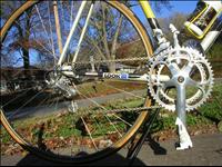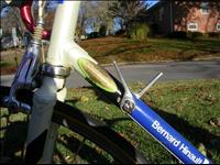 The Look Equipe was the team issue cycle selected by Bernard Tapie for his La Vie Claire team. The frameset is silver-soldered Reynolds 753 tubing and bears the distinctive La Vie Claire paint scheme. This model bears the commemorative certificate that it was produced during Hinault's retirement year of 1986. The cycle is equipped with the correct first-generation Look clipless pedals and LeMond's favorite Avocet cyclometer (one of the first available). The water bottle also bears mentioning, as this Specialized-brand Greg LeMond commemorative model was quickly recalled by Taco Bell as a choking hazard. This is one of the few that still has the original "dangerous" spout that easily comes out of the bottle into your throat if you suck on it too hard, since I never returned it to trade in for an "approved" model and free taco. |